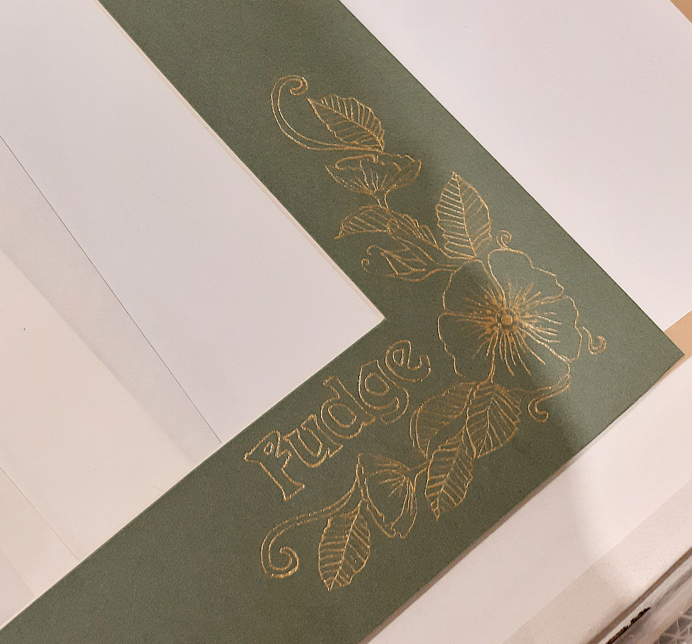 These are created using mount board and gold ink, with dog rose motif and personalisation of your choice (an example of this using a soft green mount is seen in the photographs here).