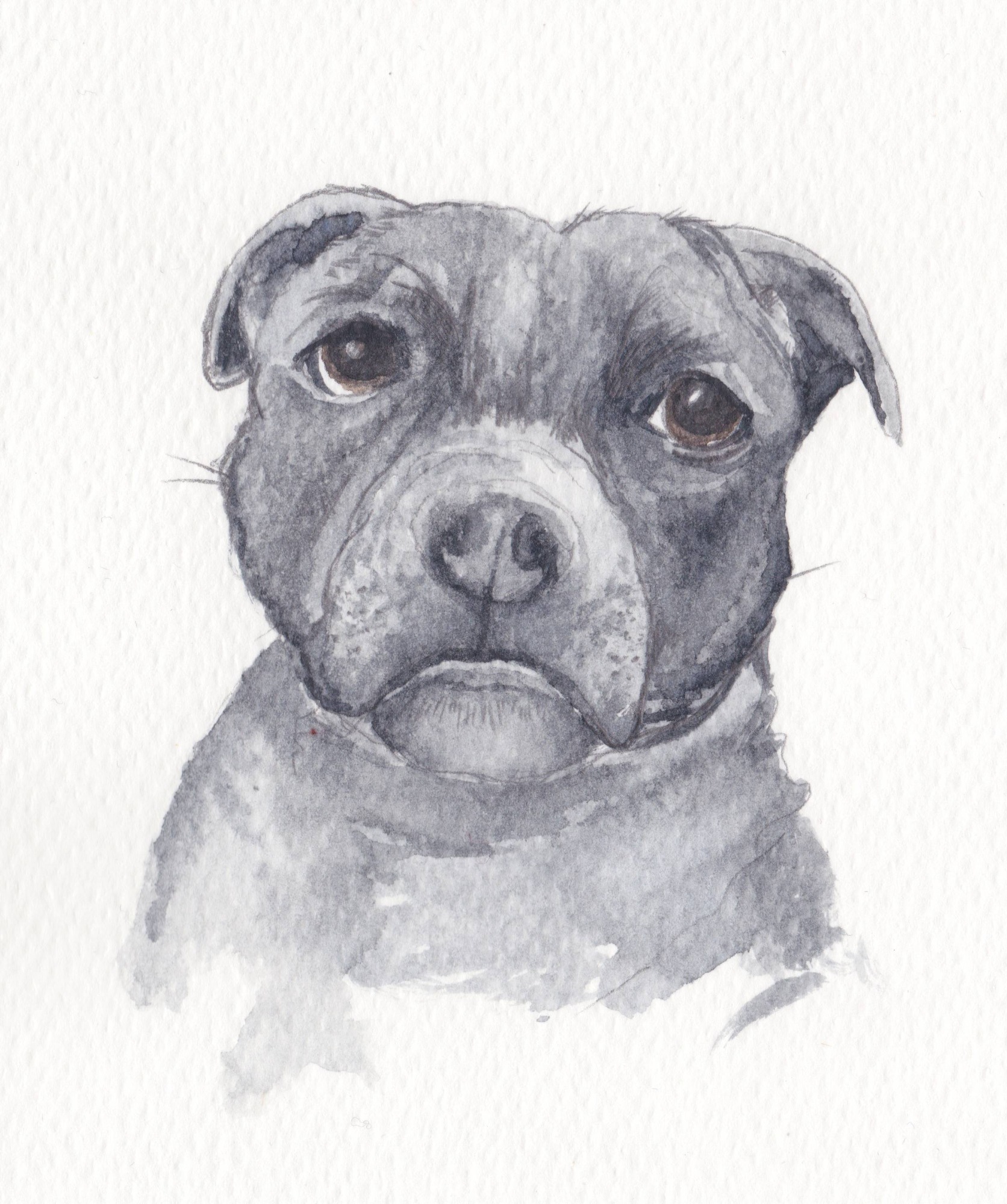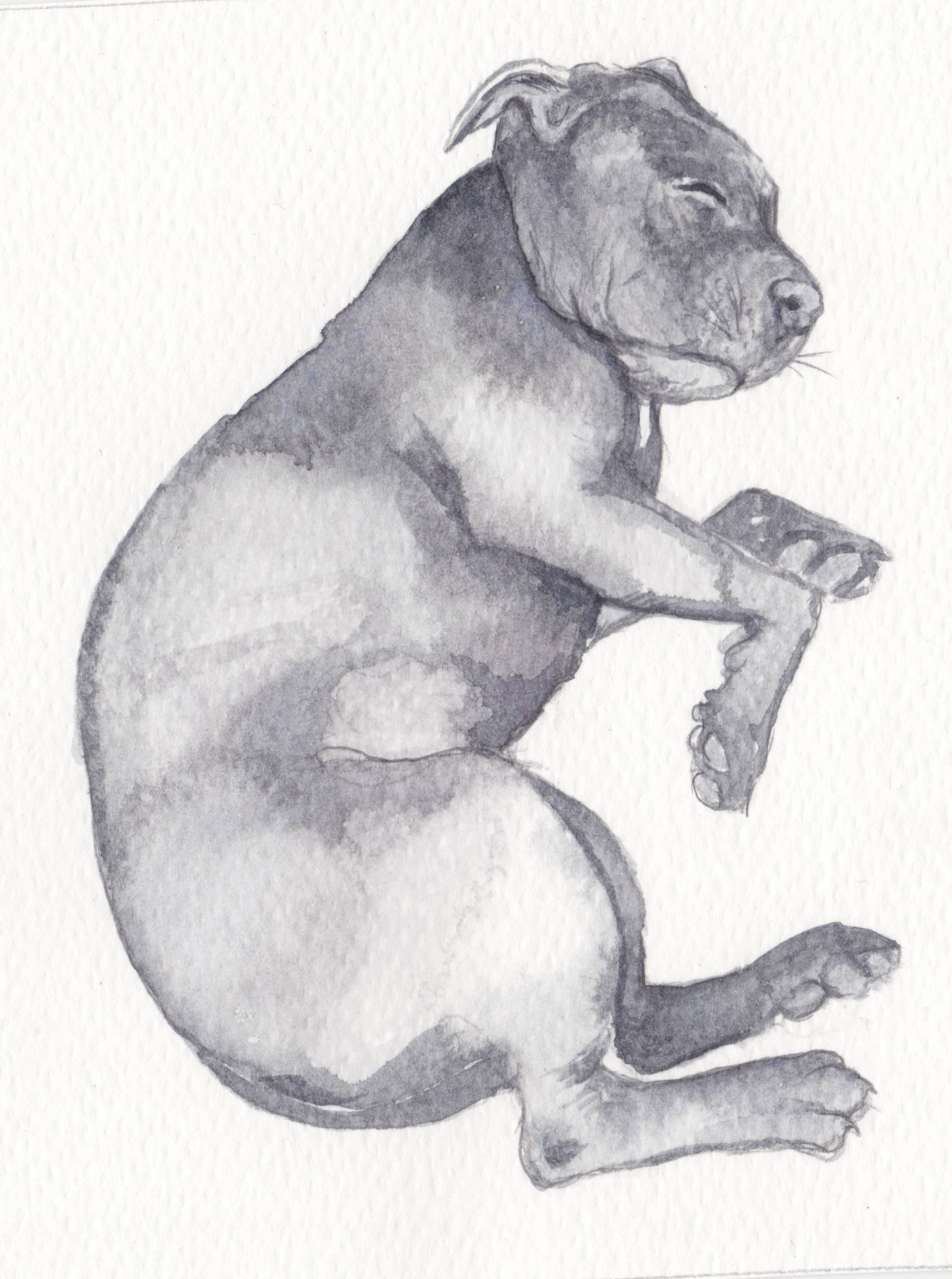 A quick series of sketches of Sally (seen here in the photograph), a blue Staffordshire Bull Terrier.
